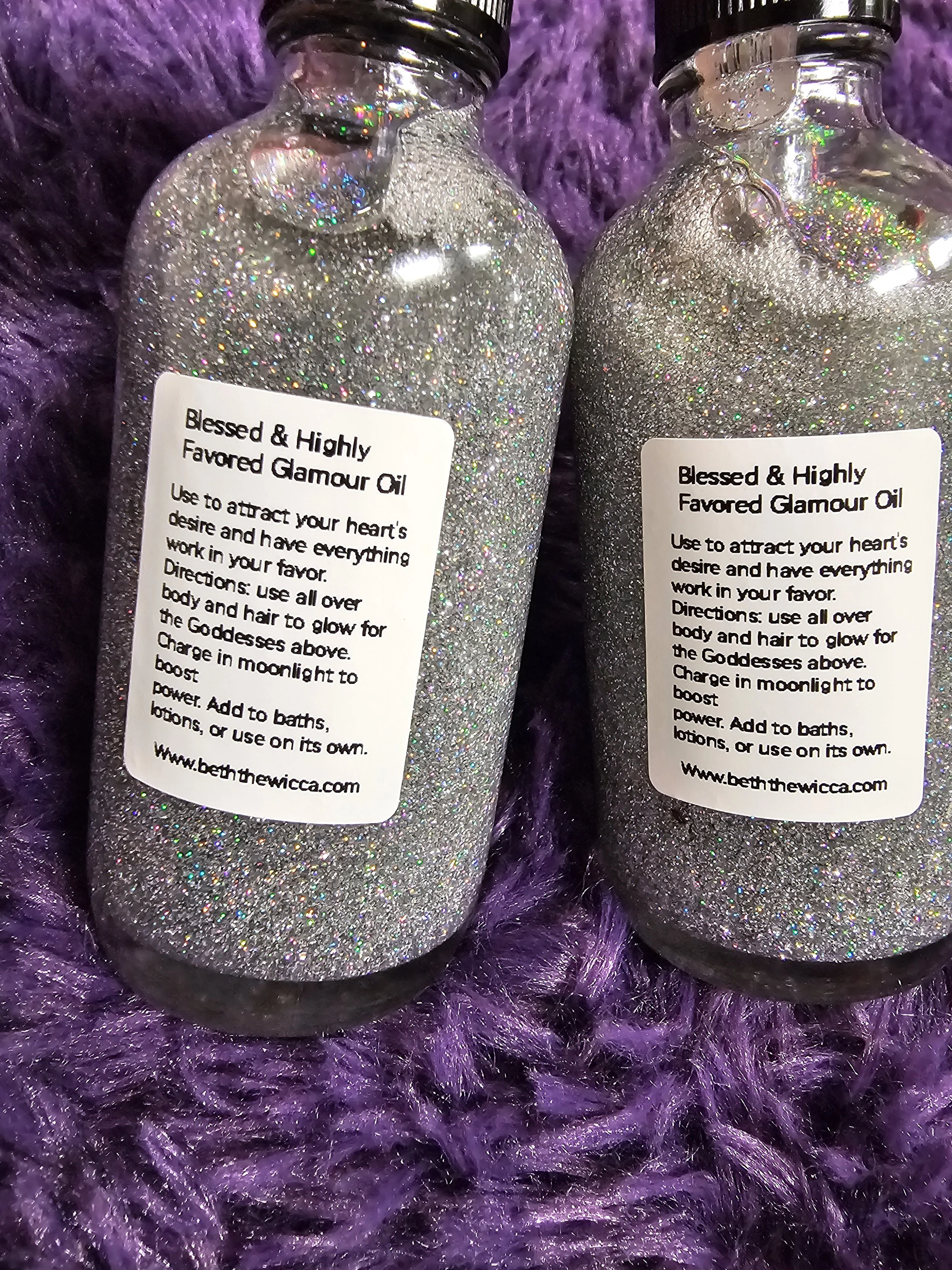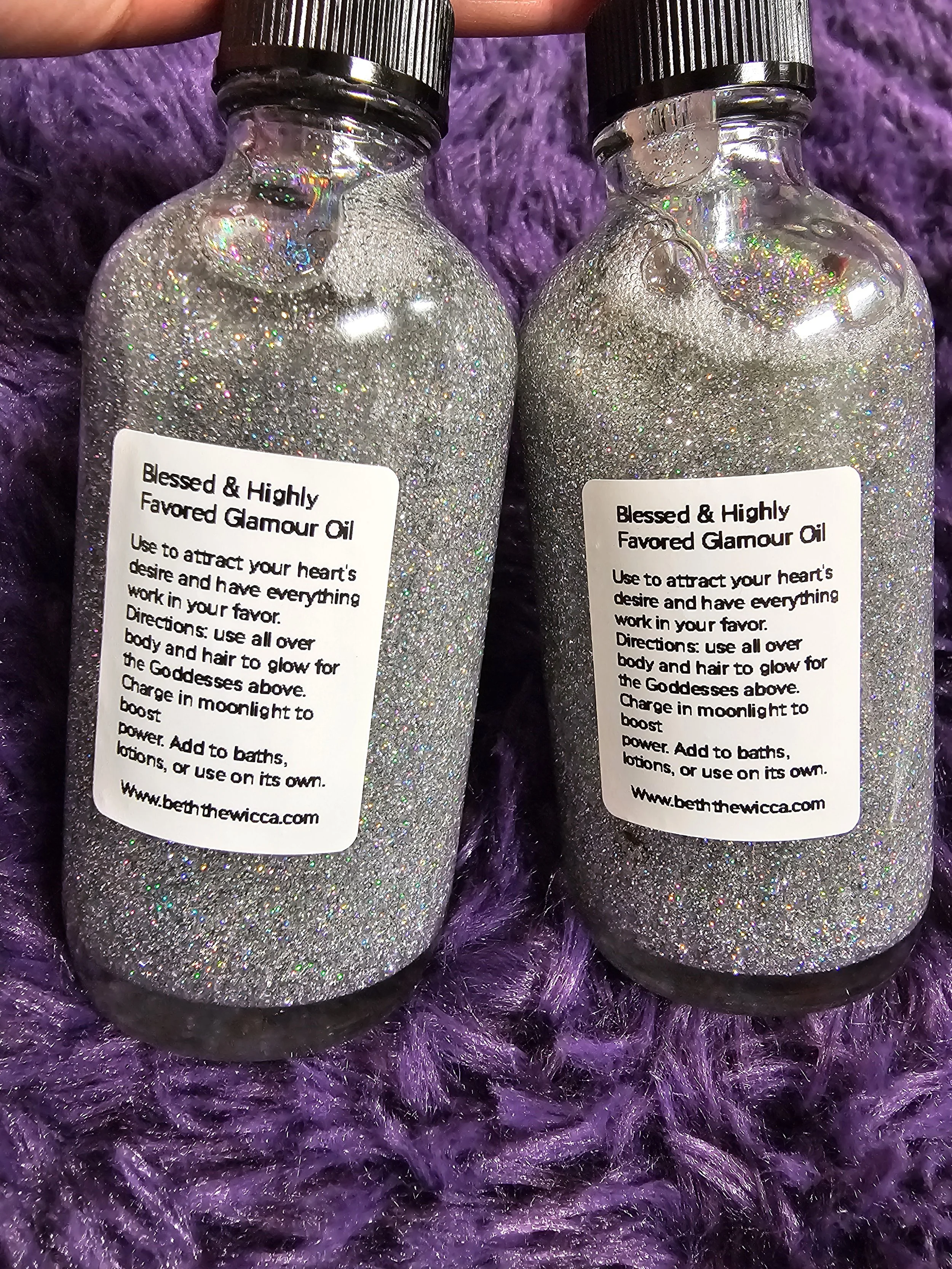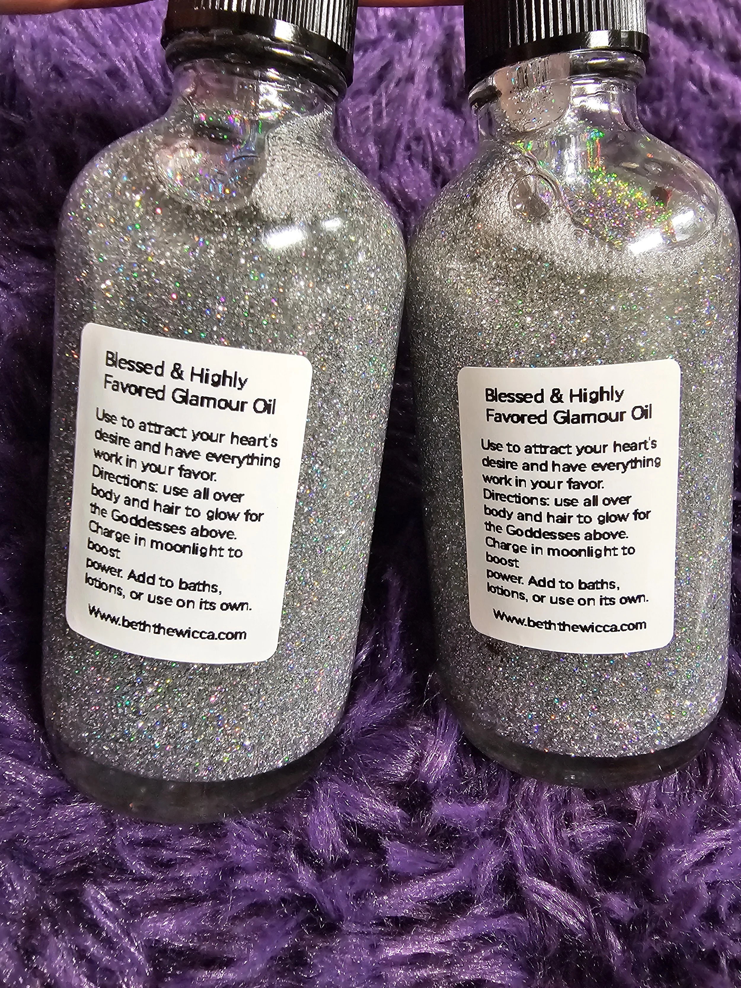 Use to attract your hearts desire ake influence everything in your favor. Made with super fine eco friendly glitter. You will glow the gods with no gritty feeling. Just super moisturized, glittery skin. This oil smells AMAZING! If you like sweet scents and vanilla you will love this!