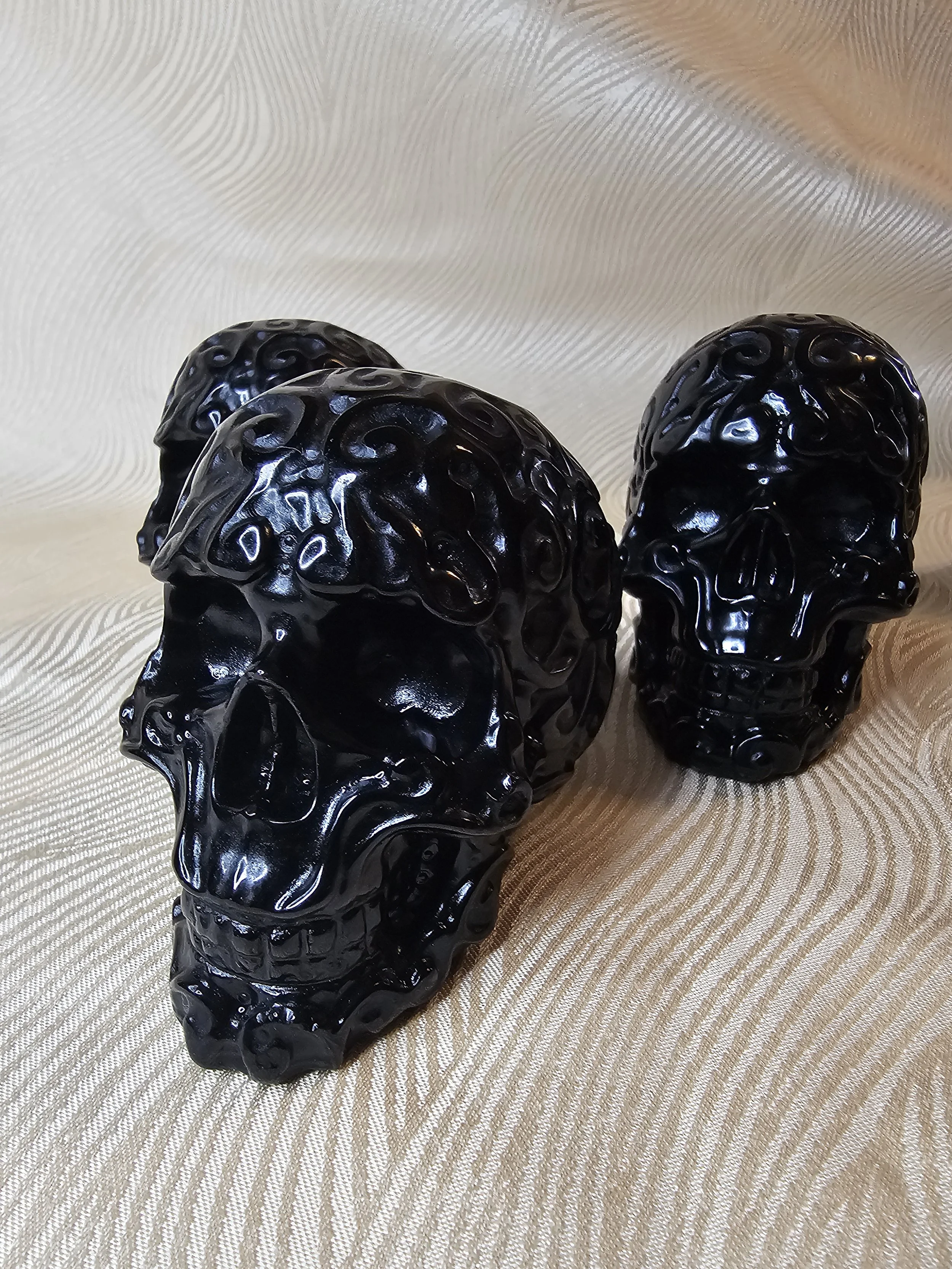 A windowsill view of the moon and night sky through a window, with a decorated table inside featuring candles, flowers, and various objects.